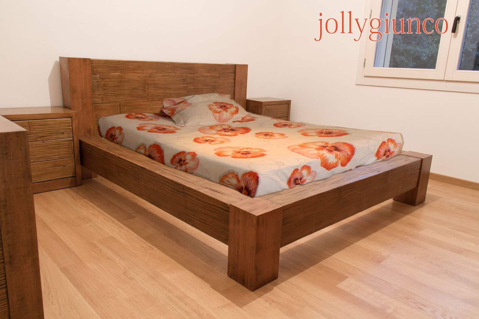 I quattro montanti, il giroletto e la testiera sono realizzati in crash bambù, lavorato a mano; tutte le altre parti sono in legno.
