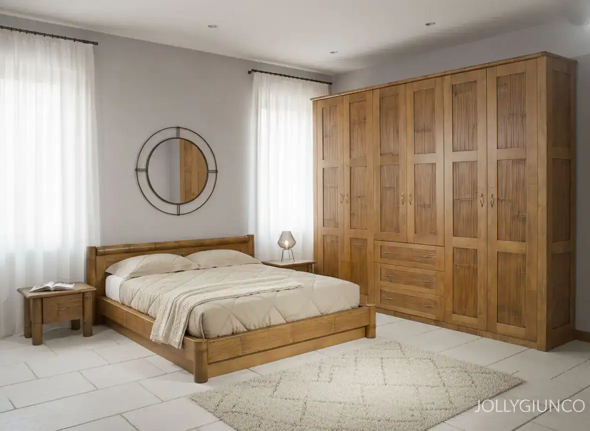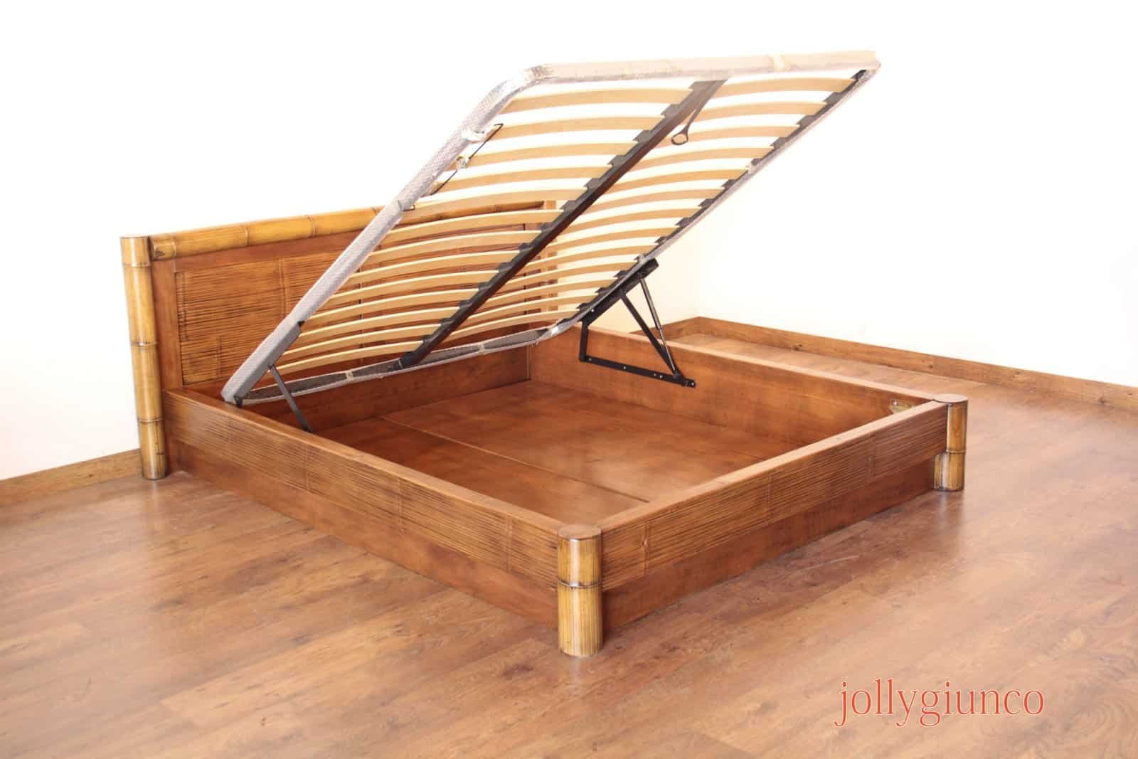 Letto matrimoniale con canne in bambù e legno massiccio con contenitore