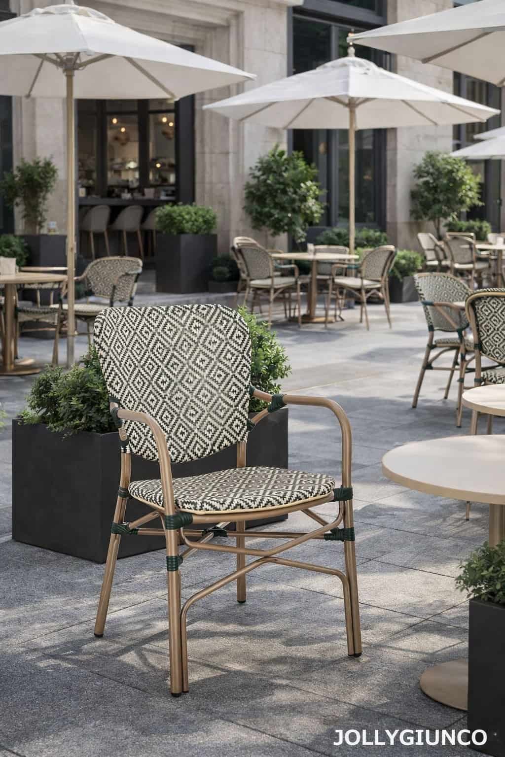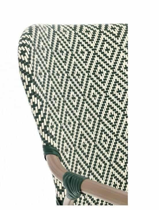 Sedia da esterno in rattan con tessuto a motivo geometrico, design elegante e resistente.