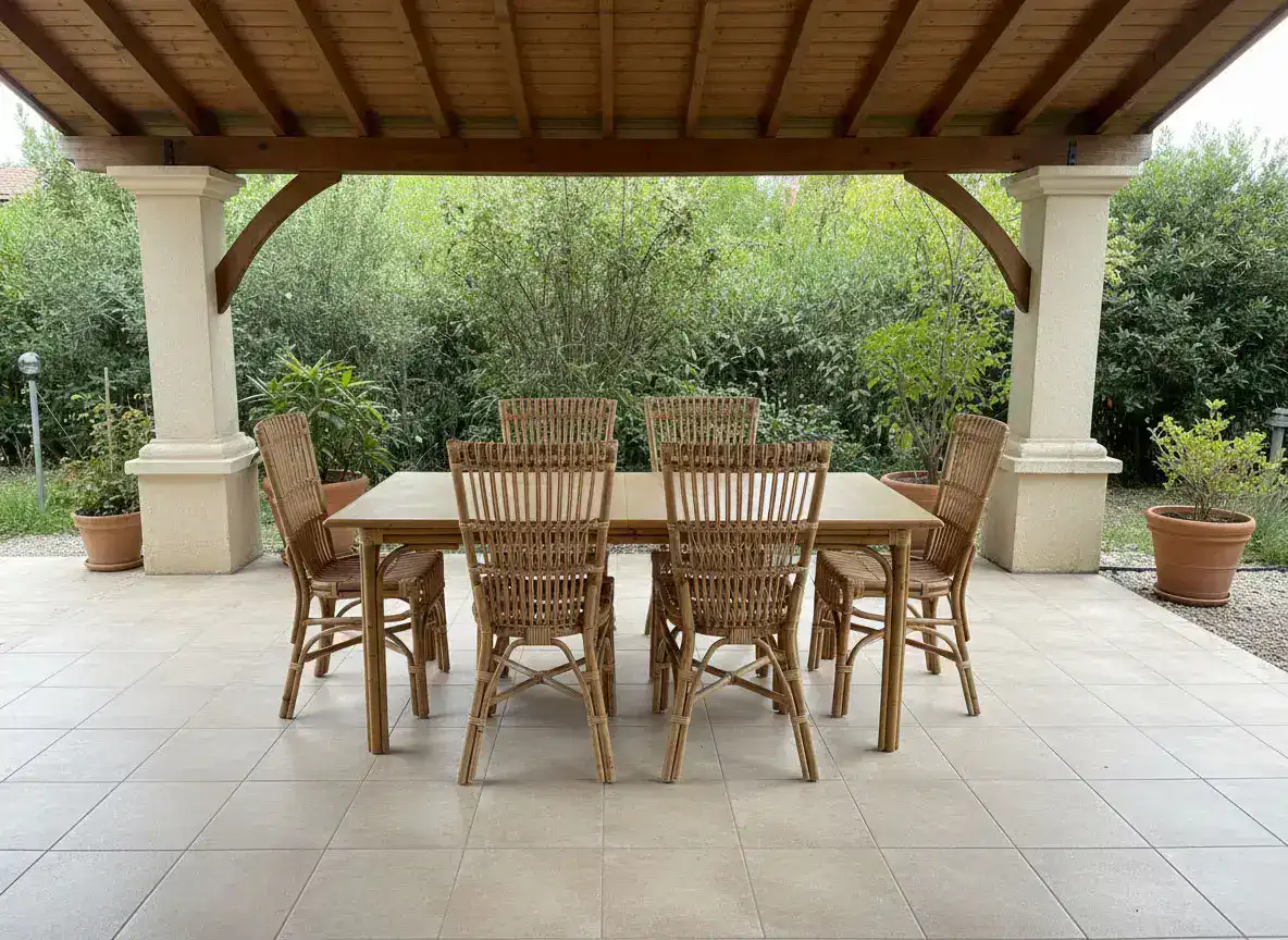 Tavolo da esterno in rattan con sedie in giardino, arredo elegante e resistente.