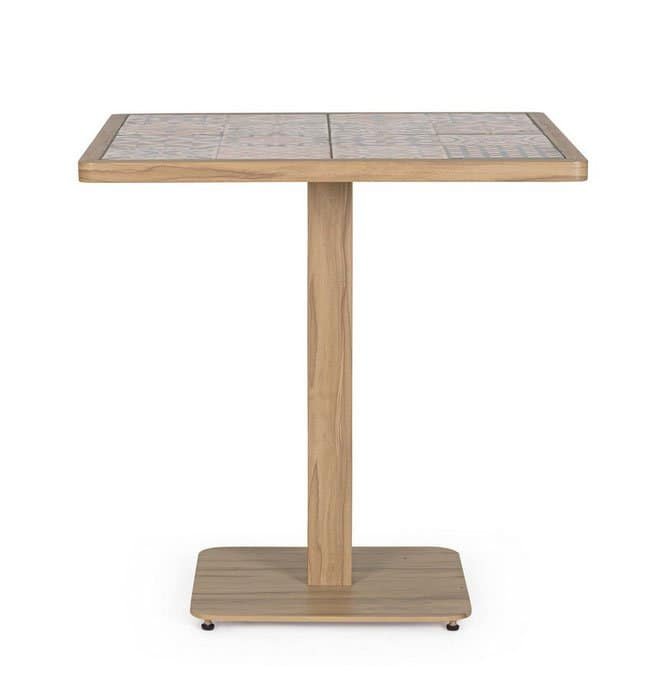 PIANO E GAMBA CENTRALE IN ALLUMINIO VERNICIATO A POLVERE (POLIESTERE). PIANO CON MATTONELLE IN PORCELLANA SMALTATA (PROVENIENZA SPAGNA). BASE IN ACCIAIO TRATTATO PER ESTERNO (E-COATING) E VERNICIATO A POLVERE (POLIESTERE). PIEDINI REGOLABILI. VITERIA IN ACCIAIO INOSSIDABILE. DA ASSEMBLARE.