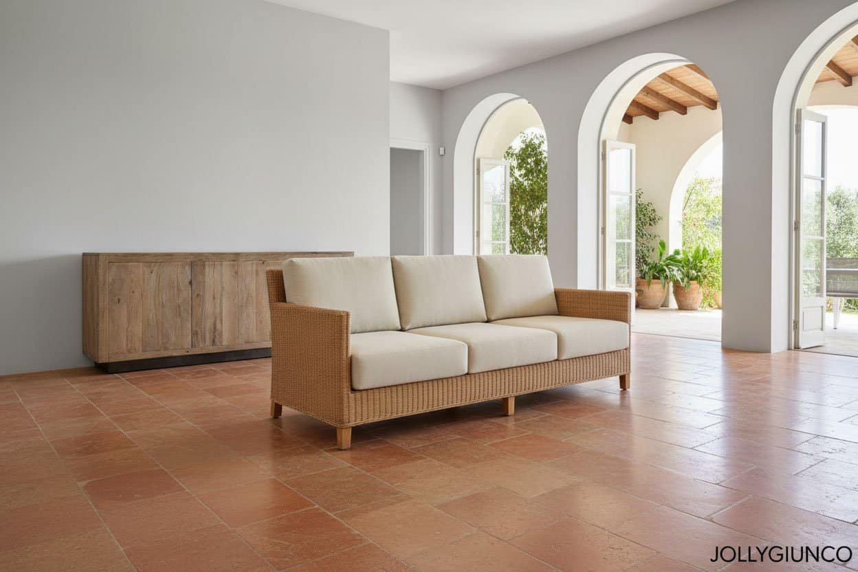 Il divano in rattan Tiffany ha un telaio in legno, intrecciato in giunchino o midollino naturale da 3 mm con finitura trasparente opaca.