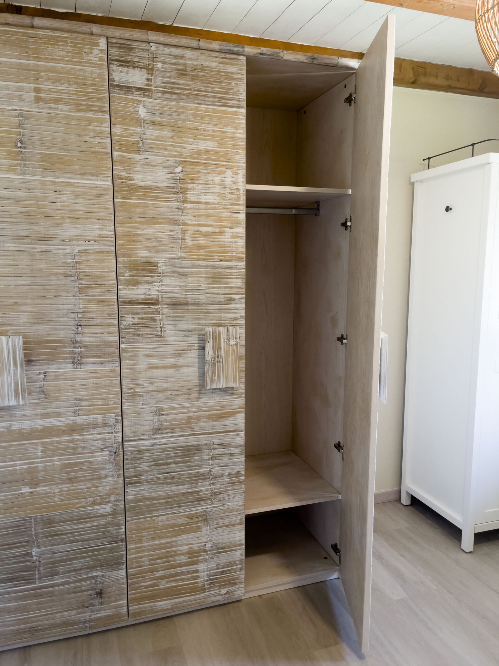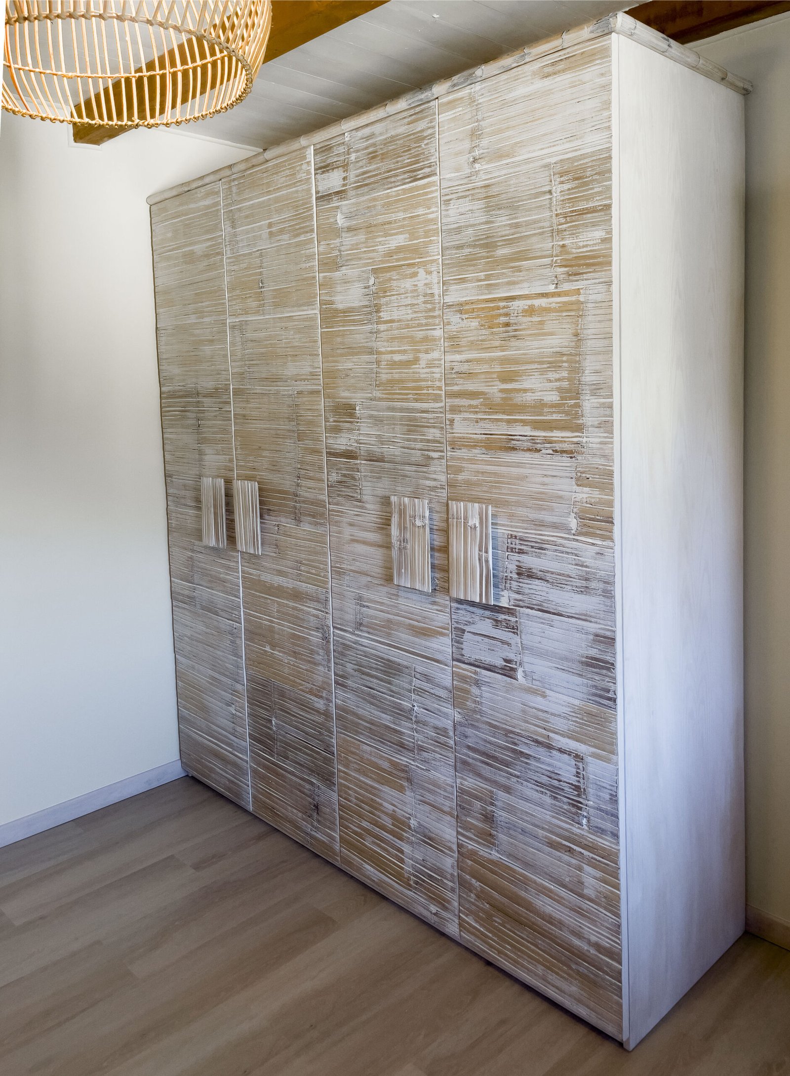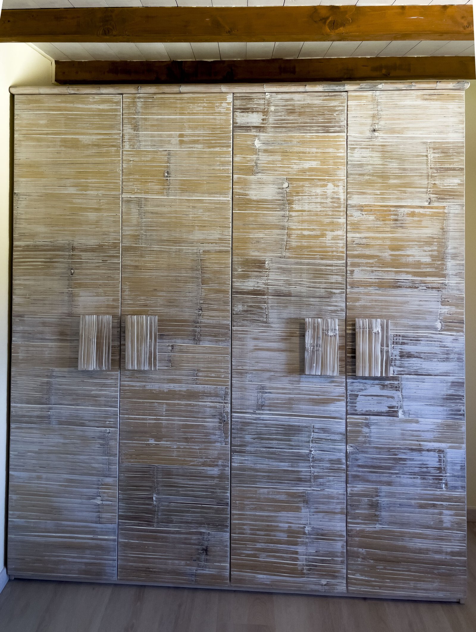 Armadio a 4 ante battenti realizzato artigianalmente, caratterizzato da un’elegante combinazione di crash bambù e legno massiccio con spessore di 25 mm, ideale per arredare ambienti con stile naturale e raffinato.