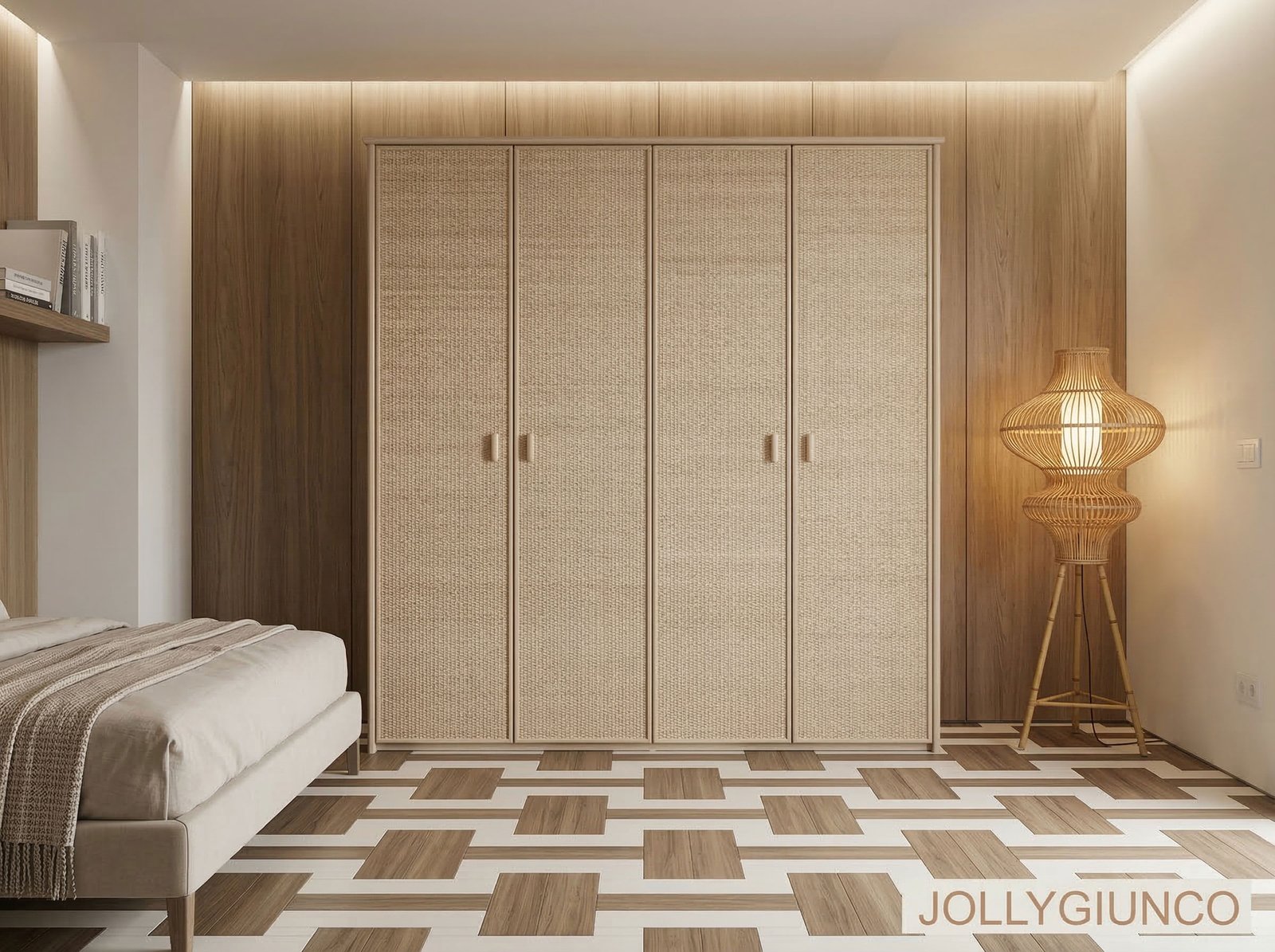 Elegante armadio in rattan dal design naturale e raffinato, ideale per camere da letto moderne e classiche. Questo armadio alto è composto da 4 ante e all’interno offre un ripiano superiore, un ripiano inferiore e un paletto appendiabiti, perfetto per organizzare abiti, giacche e accessori.