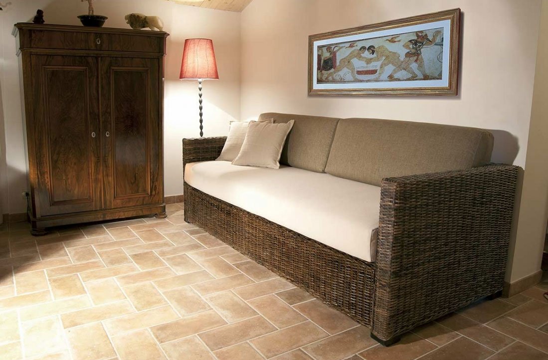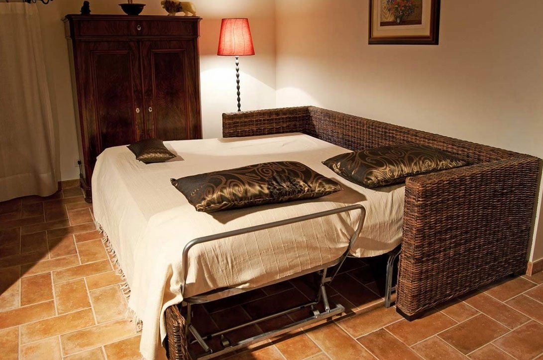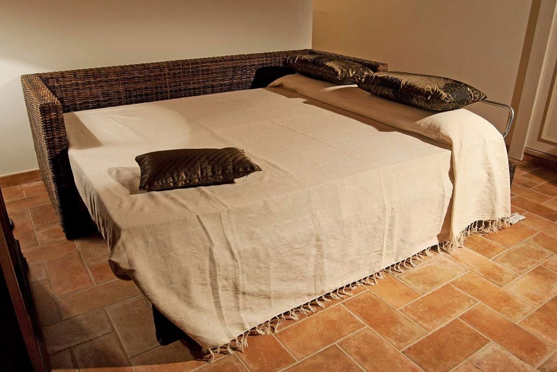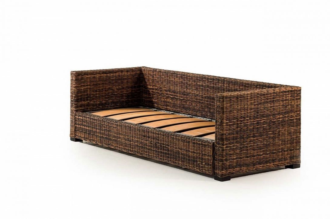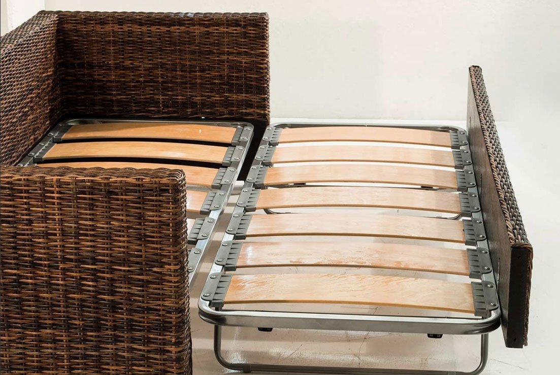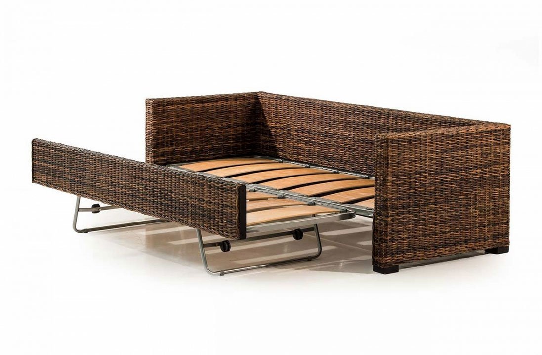 Divano letto con telaio in legno ed intreccio in rattan naturale. Finitura trasparente opaca