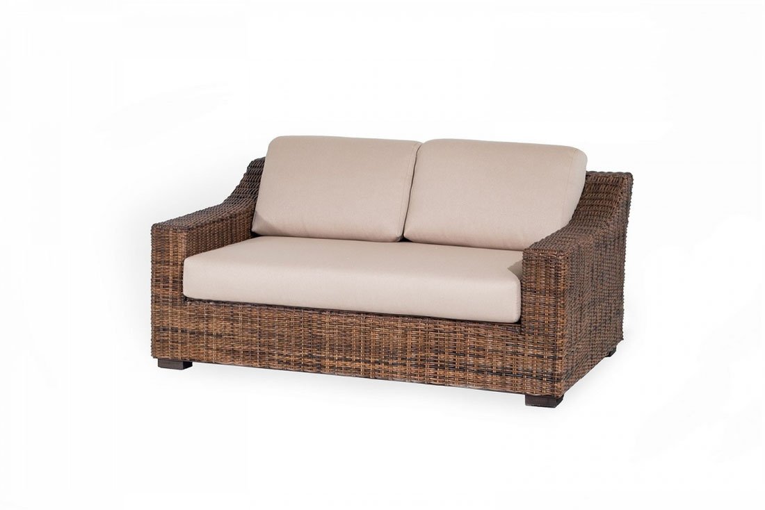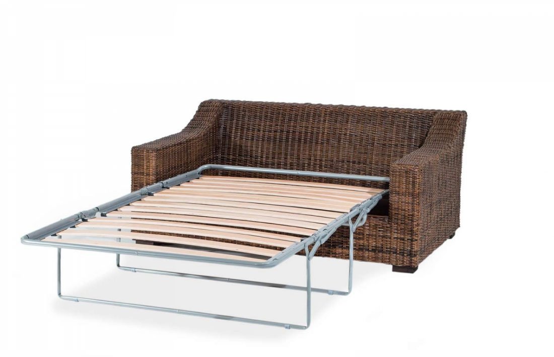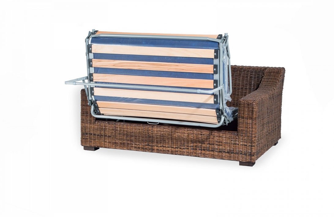 Divano letto con telaio in legno ed intreccio in rattan naturale. Finitura trasparente opaca