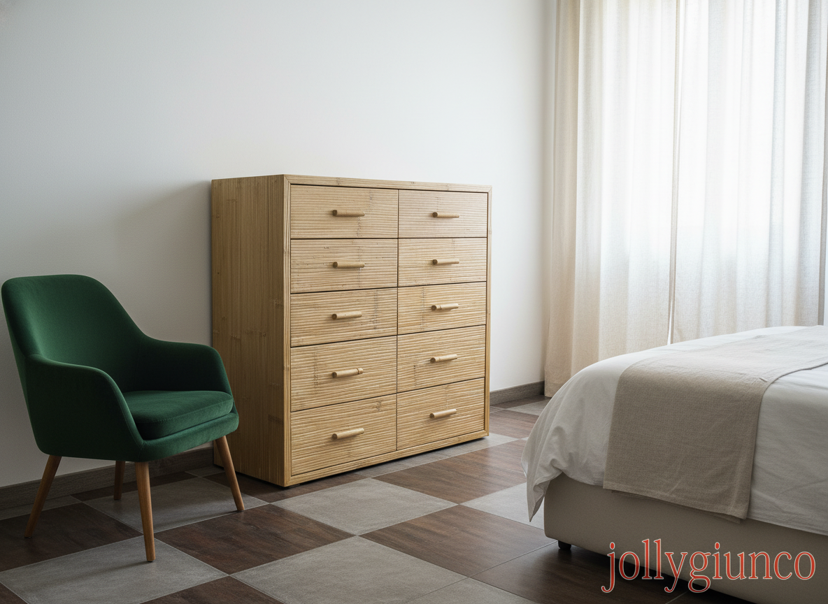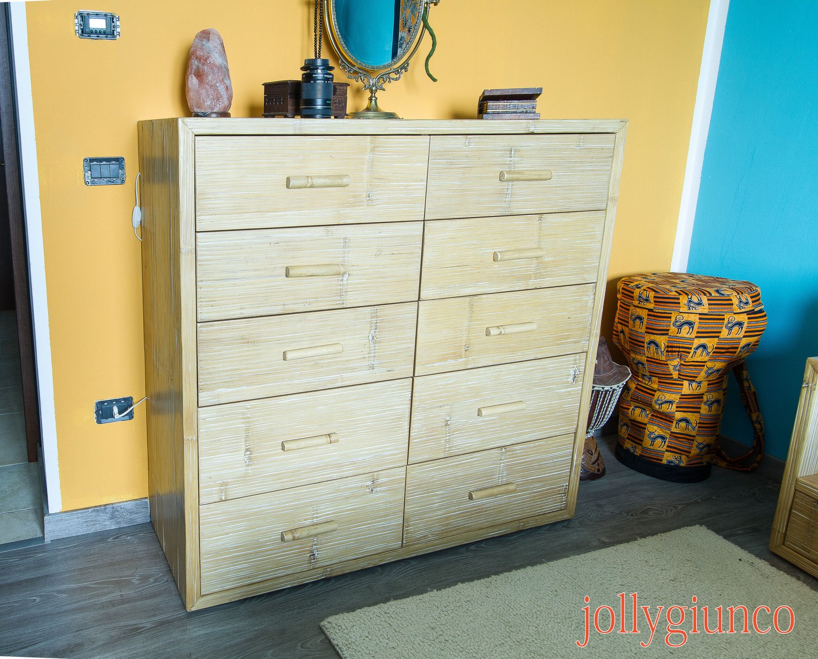 Cassettiera artigianale realizzata in crash bambù (bambù rotto) e legno listellare tamburato, pensata per unire funzionalità e design naturale. La struttura prevede 10 cassetti organizzati in modo ergonomico: i due cassetti inferiori sono alti 25 cm, mentre gli altri tre superiori misurano 17 cm, sia sul lato destro che sinistro, per una perfetta gestione dello spazio.