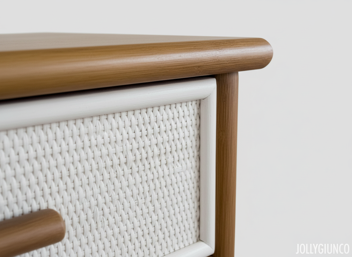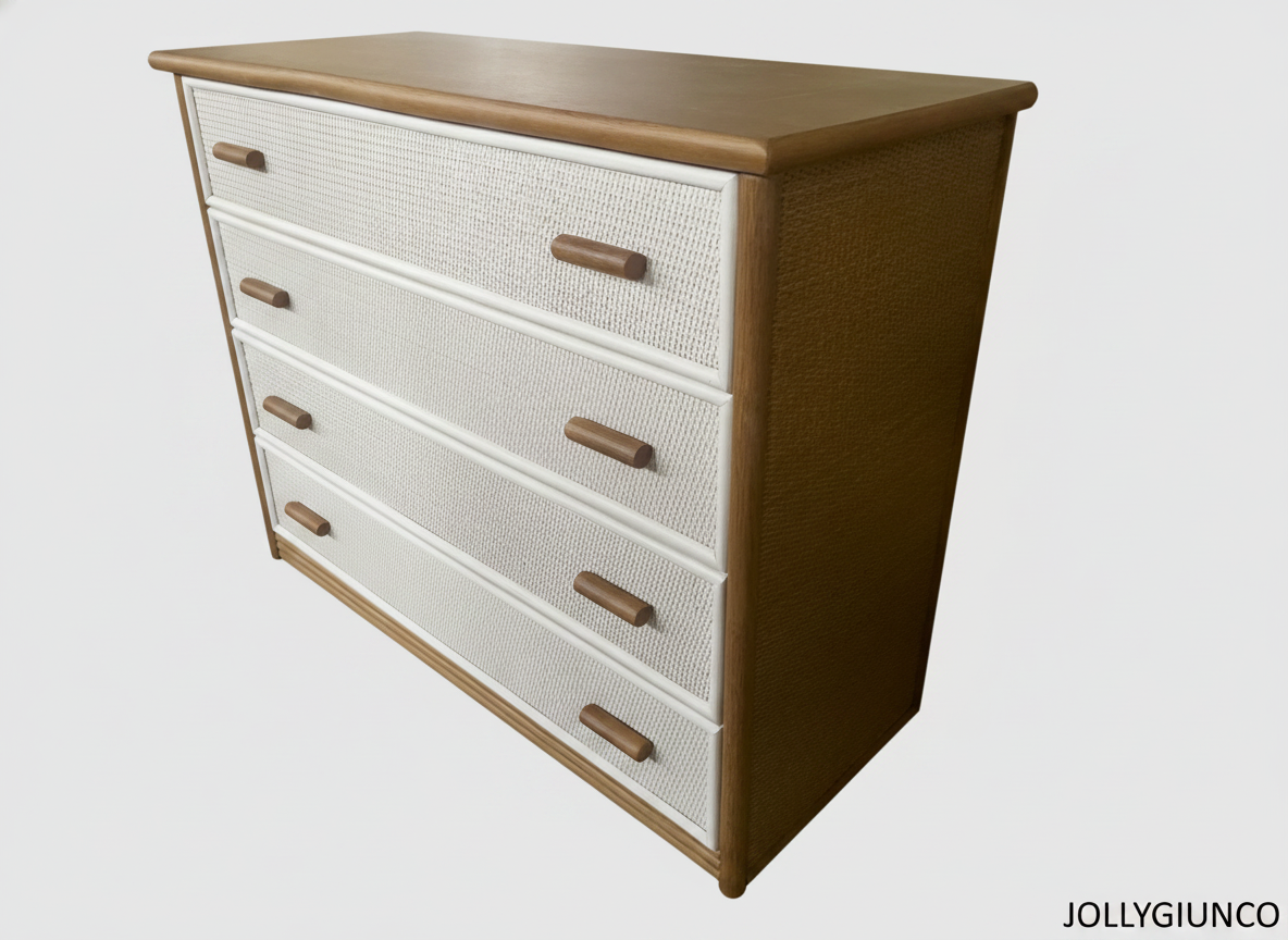 Elegante cassettone artigianale in rattan, dotato di 4 cassetti con guide in ferro per una scorrevolezza duratura e affidabile. Il piano in legno massiccio aggiunge solidità e funzionalità, ideale per appoggiare oggetti decorativi o quotidiani.