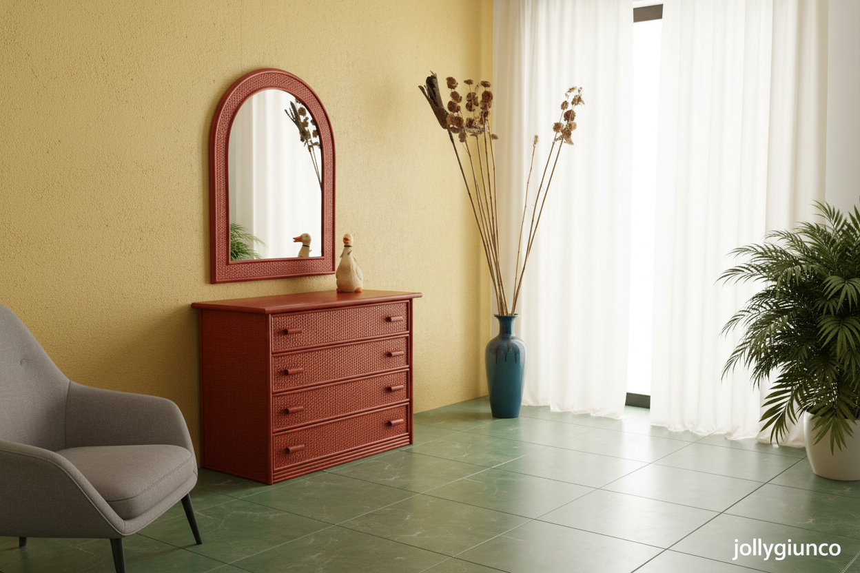 Specchio con cornice in rattan lavorata artigianalmente, dal design ad arco elegante, perfetto da abbinare al cassettone per creare un angolo raffinato e armonioso in camera o in altri ambienti della casa.