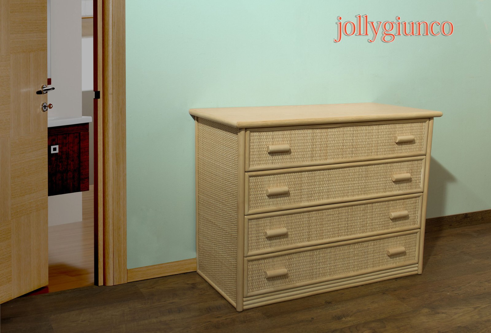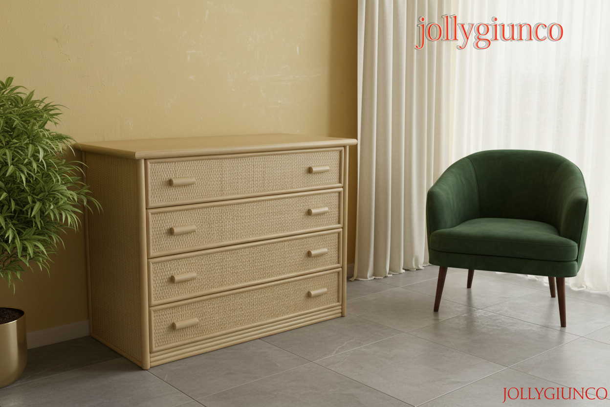 Cassettone in rattan con 4 ampi cassetti dotati di guide in ferro, progettato per garantire solidità e praticità nell’utilizzo quotidiano. Il piano superiore è in legno, resistente ed elegante.