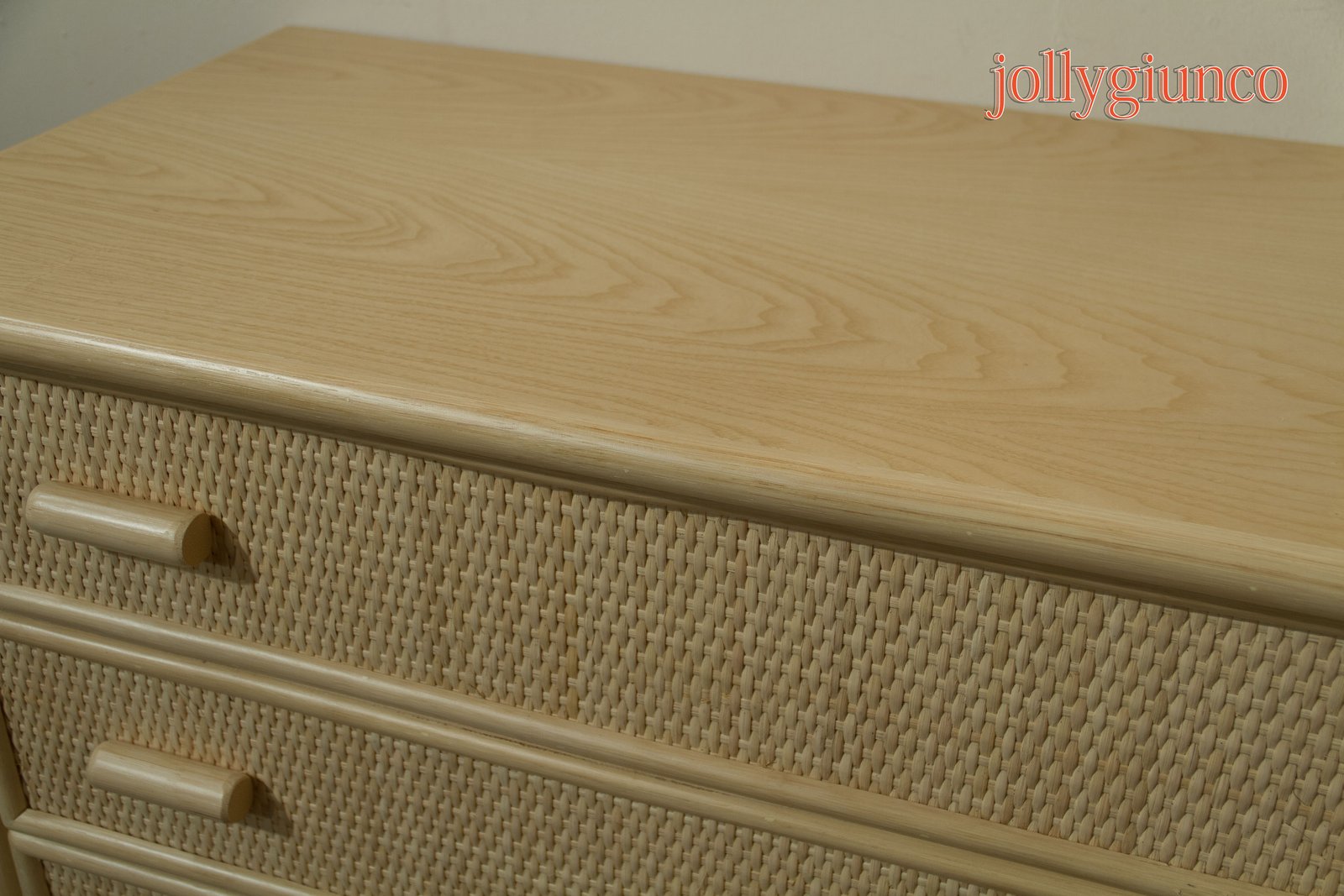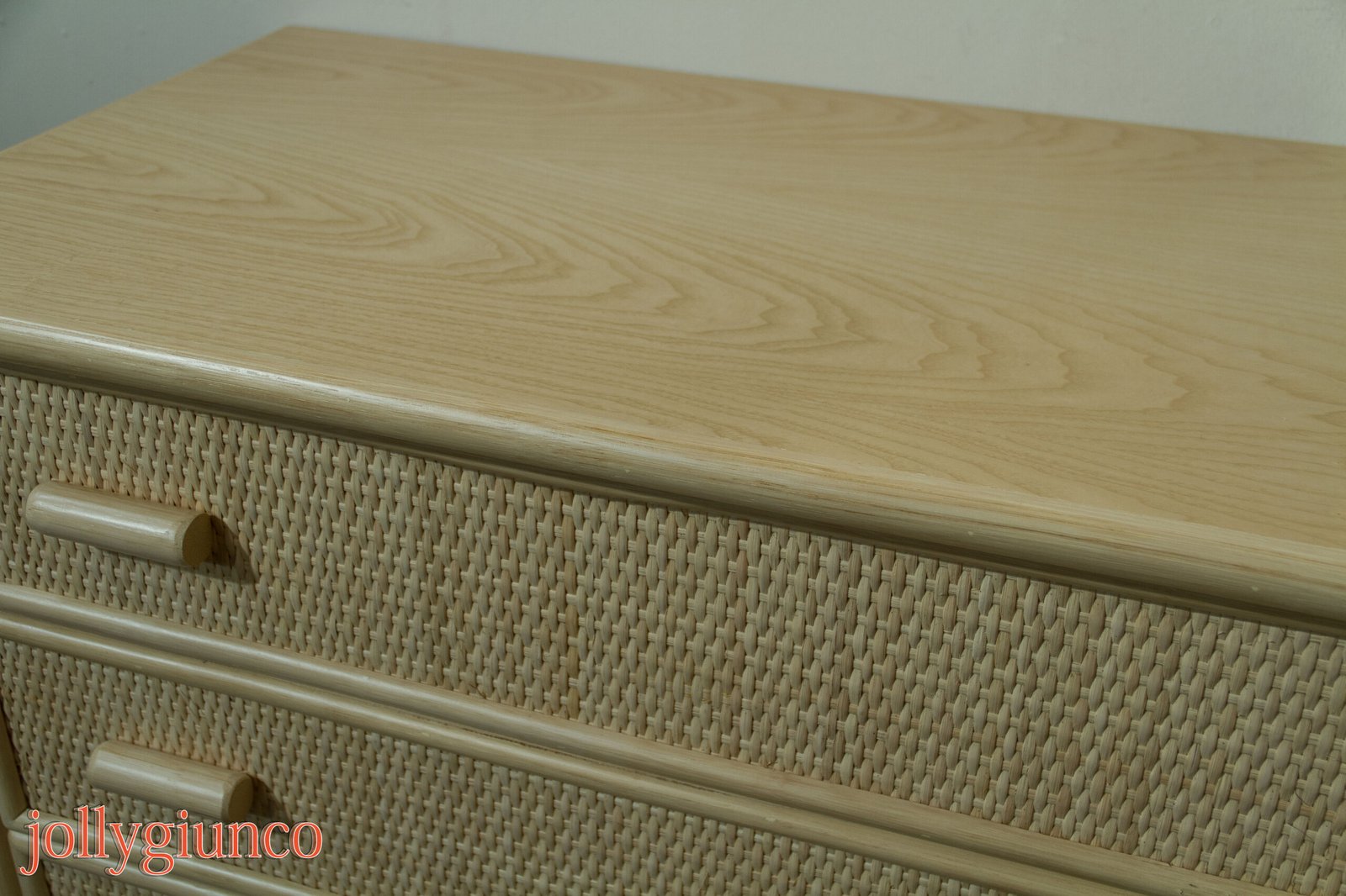 Struttura in nobilitato rovere rivestita in tessuto di rattan intreccio 5×5. Le cornici dei cassetti sono realizzate in rattan pieno lavorato interamente a mano, colorato con tinta all’anilina e rifinito con vernice trasparente che protegge il materiale esaltandone la naturale bellezza.