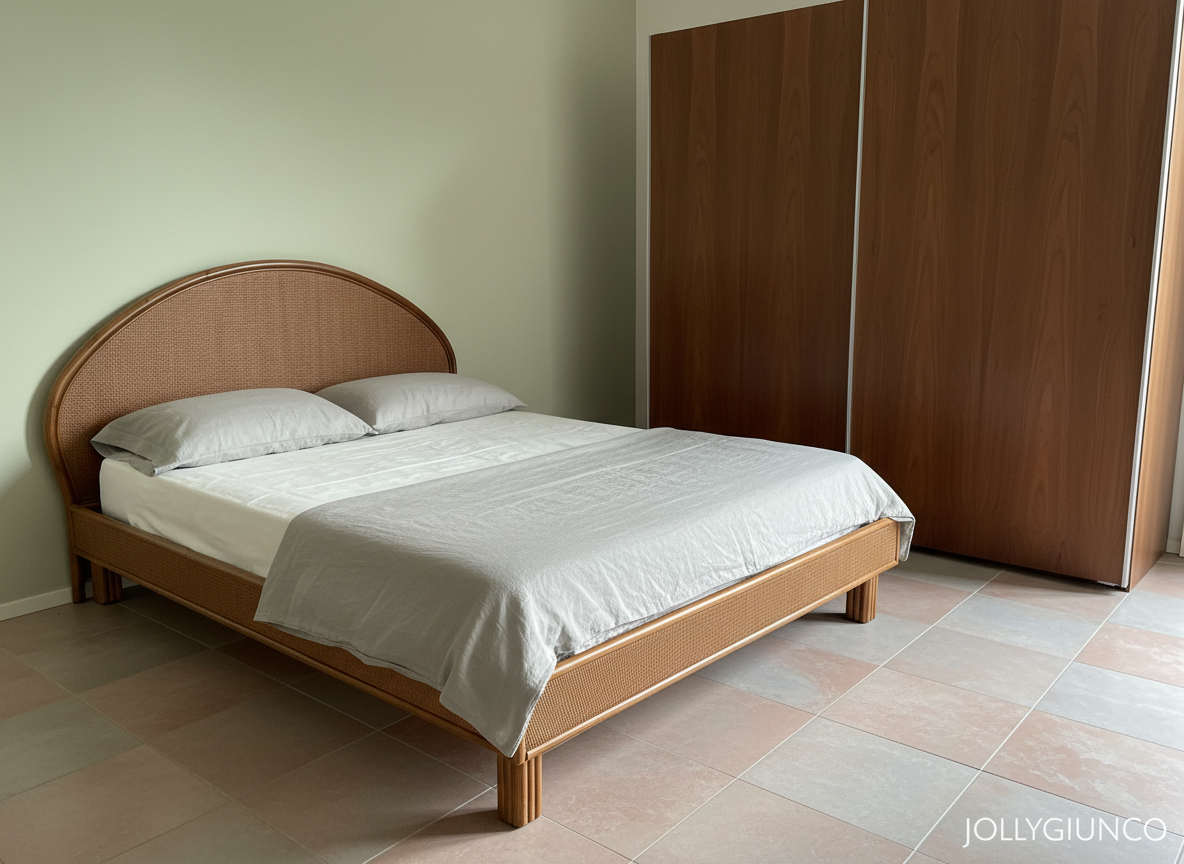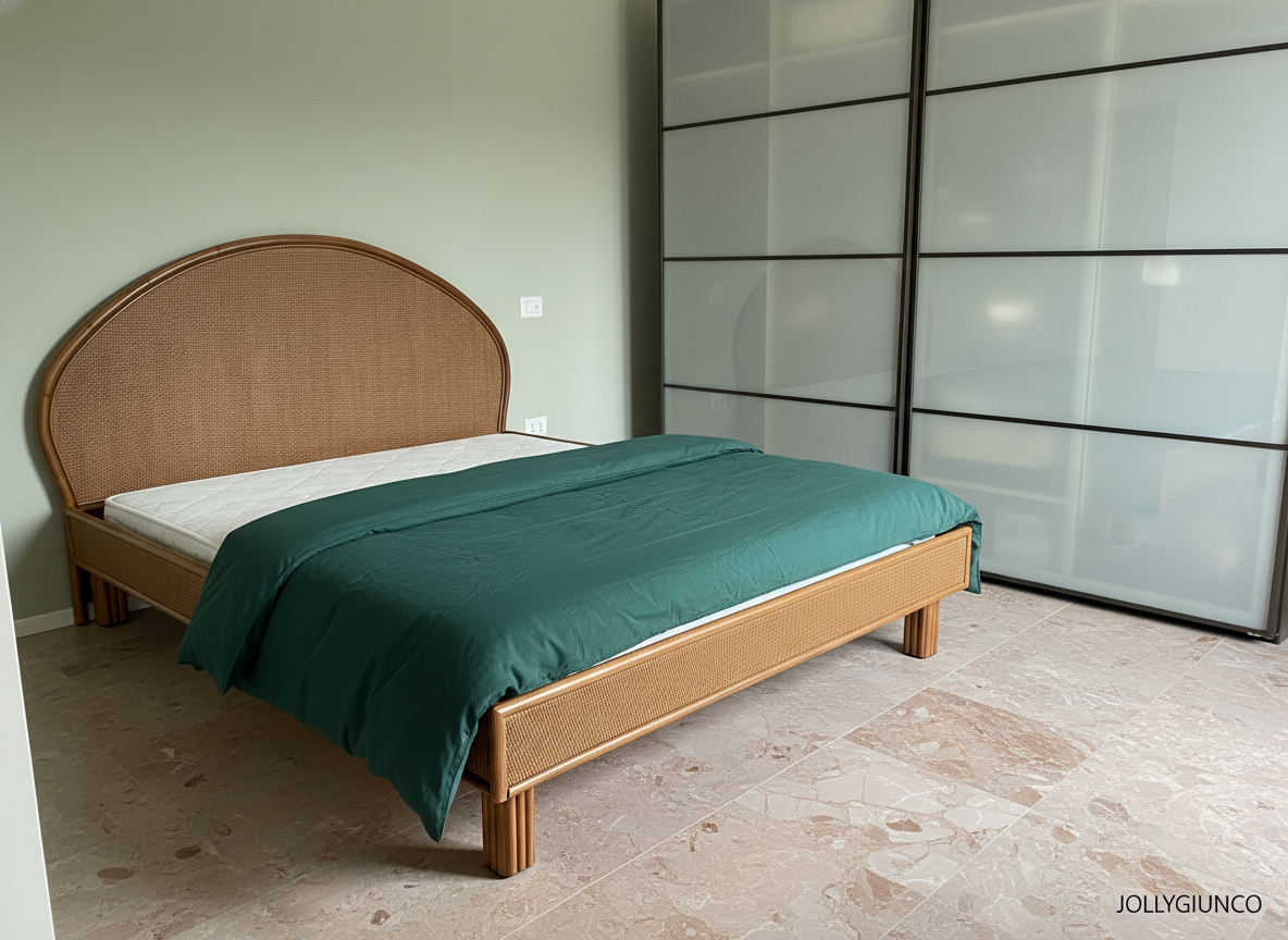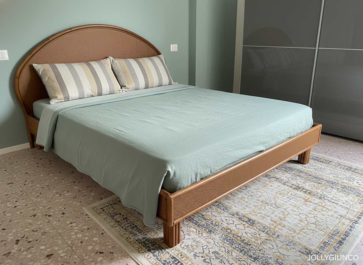 Questo letto matrimoniale in rattan artigianale è realizzabile su misura e in varie colorazioni, adattandosi a ogni esigenza di spazio e arredamento.
