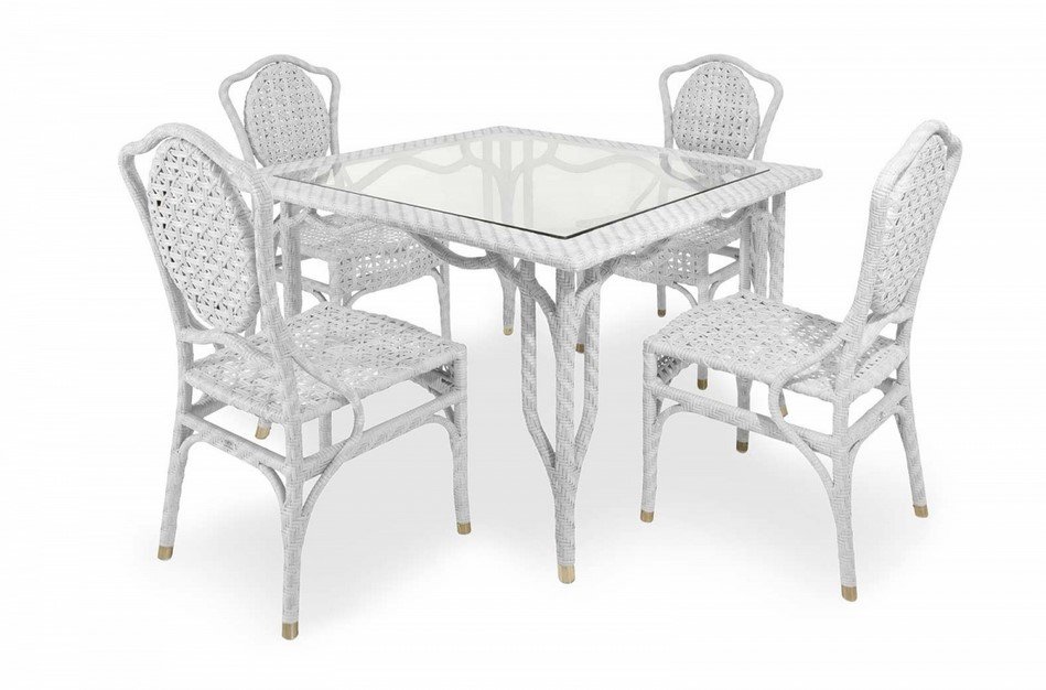 • Tavolo da pranzo interamente intrecciato a mano da maestri artigiani; top in vetro.
