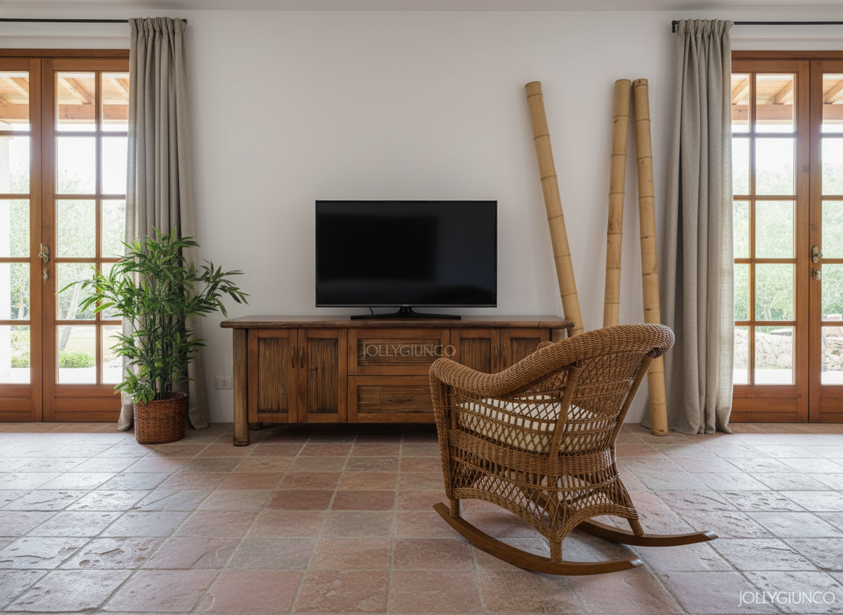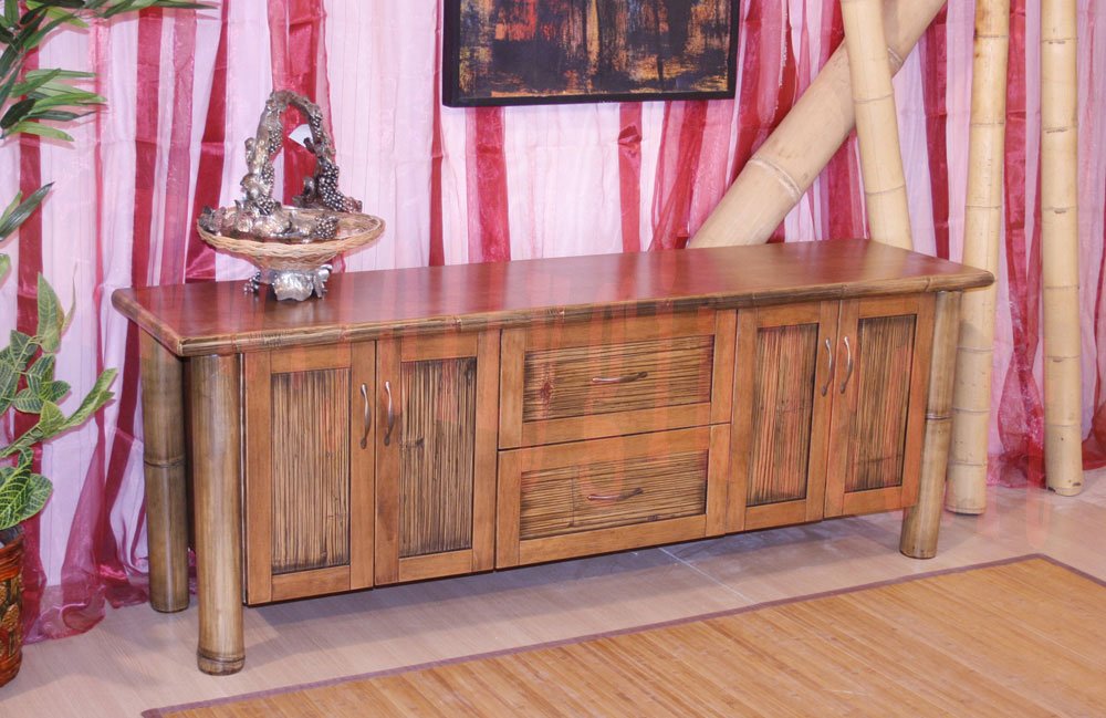 Mobile PV basso a 4 ante e 2 cassetti in crash bambù, con inserti in canne di bambù e struttura in legno massiccio. All’interno è presente un pratico ripiano, ideale per organizzare al meglio gli spazi.