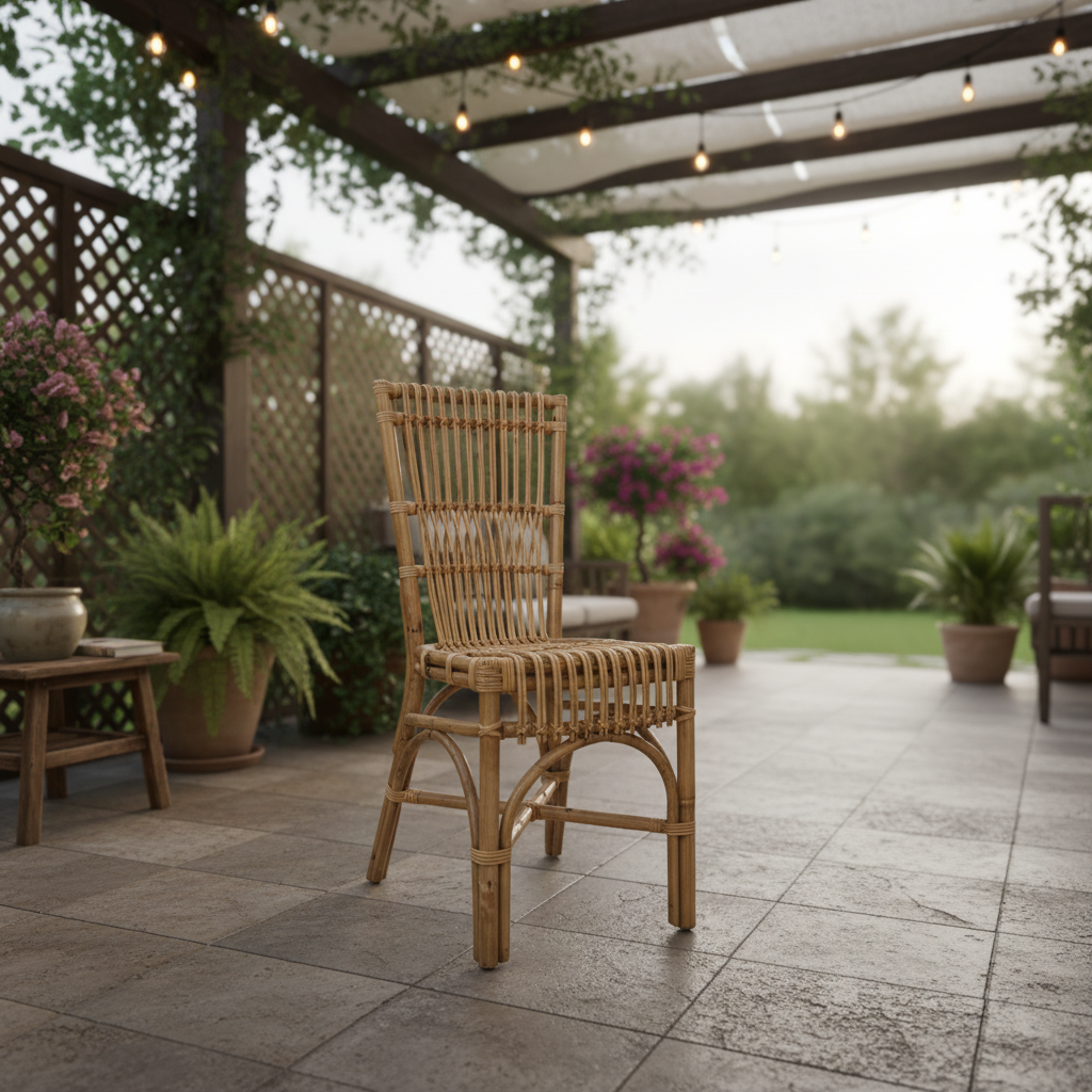 Elegante e versatile, la sedia è realizzata in giunco naturale, perfetta per arredare ambienti interni con uno stile caldo e accogliente. Grazie alla sua struttura resistente ma leggera, si adatta anche a balconi coperti o verande, mantenendo nel tempo il suo fascino naturale.