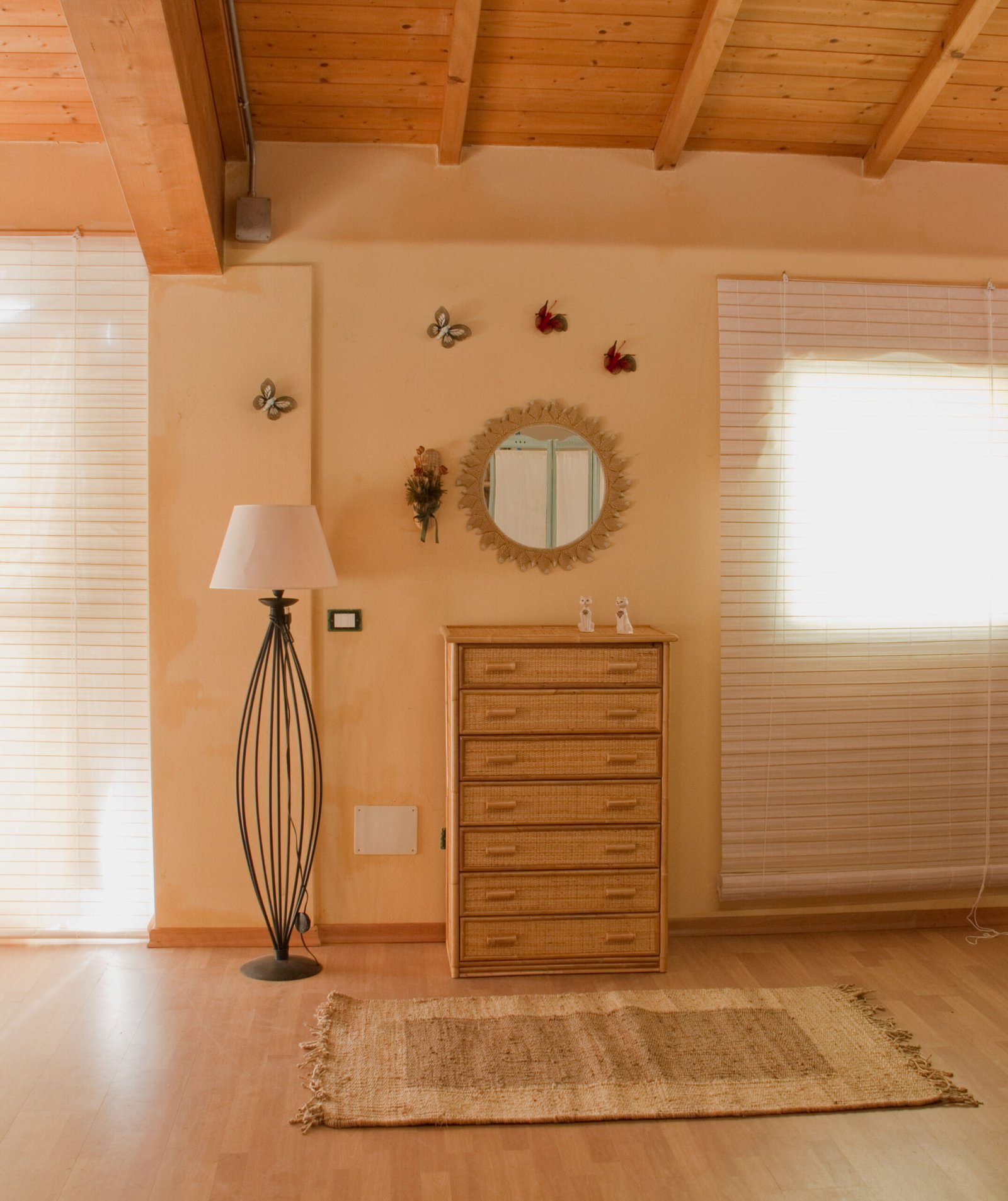 Realizzata in nobilitato rovere rivestito in tessuto di giunco 3×3.